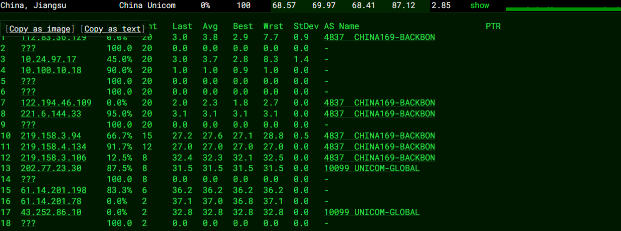 北京 联通 AS328333 -> 10099 地理路径:新加坡 -> 香港 -> 广东 -> 北京 自治系统路径:AS54801 -> AS328333 -> AS10099 -> AS4837 -> AS4808 1 5.22ms 109.248.*.* AS54801 新加坡 2-6 0.60ms 10.148.*.* * RFC1918 7 36.15ms 163.181.*.* AS328333 [AL-3] 中国 香港 fixedmobile.com 8-10 38.77ms 162.245.*.* AS10099 [CUG-BACKBONE] 中国 香港 chinaunicomglobal.com 联通 11-12 42.45ms 219.158.*.* AS4837 [CU169-BACKBONE] 中国 广东 广州 chinaunicom.cn 15-16 80.95ms 202.96.*.* AS4808 [UNICOM-BJ] 中国 北京 www.bbn.com.cn 联通 20 76.59ms 221.222.*.* AS4808 [UNICOM-BJ] 中国 北京 海淀 www.bbn.com.cn 上海 联通 NTT -> 4837 地理路径:新加坡 -> 北京 -> 上海 自治系统路径:AS54801 -> AS2914 -> AS4837 -> AS140979 1 2.22ms 109.248.*.* AS54801 新加坡 2-3 0.70ms 10.148.*.* * RFC1918 4 1.35ms 116.51.*.* AS2914 [NTT-GIN] 新加坡 gin.ntt.net 5 170.89ms 129.250.*.* AS2914 [NTT-BACKBONE] 新加坡 gin.ntt.net 6-8 94.46ms 219.158.*.* AS4837 [CU169-BACKBONE] 中国 北京 chinaunicom.cn 联通 16 111.59ms 112.64.*.* AS140979 [APNIC-AP] 中国 上海市 闵行 chinaunicom.cn 联通 广东 联通 Level3 -> 4837 地理路径:新加坡 -> 美国 -> 广东 自治系统路径:AS54801 -> AS2914 -> AS3356 -> AS4837 -> AS17816 -> AS136958 1 3.70ms 109.248.*.* AS54801 新加坡 2-3 1.35ms 10.148.*.* * RFC1918 4 1.55ms 116.51.*.* AS2914 [NTT-GIN] 新加坡 gin.ntt.net 5-6 173.63ms 129.250.*.* AS2914 [NTT-BACKBONE] 新加坡 gin.ntt.net 7 2.12ms 4.68.*.* AS3356 新加坡 lumen.com 8-9 273.55ms 4.69.*.* AS3356 美国 加利福尼亚 洛杉矶 lumen.com 10-12 281.97ms 219.158.*.* AS4837 [CU169-BACKBONE] 中国 广东 广州 chinaunicom.cn 联通 13 282.49ms 120.83.*.* AS17816 [APNIC-AP] 中国 广东 广州 中国联通 联通 15 282.90ms 58.254.*.* AS136958 中国 广东 广州 chinaunicom.cn 19 288.78ms 157.148.*.* AS136958 [UNICOM-GD] 中国 广东省 广州市 chinaunicom.cn 联通