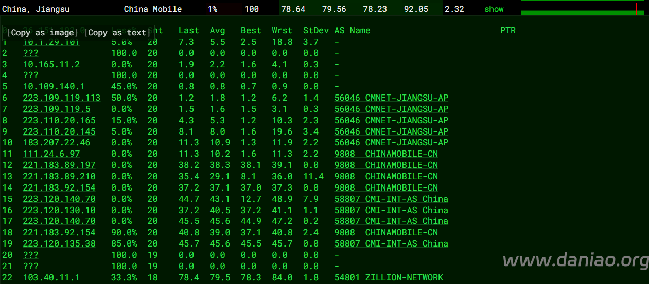 北京 移动 AS54801 -> CTGGIA 地理路径:新加坡 -> 香港 -> 北京 自治系统路径:AS54801 -> AS23764 -> AS4809 -> AS4134 -> AS56048 1 1.75ms 109.248.*.* AS54801 新加坡 2 0.65ms 10.148.*.* * RFC1918 7 37.70ms 203.144.*.* * 新加坡 电信 8 37.64ms 69.194.*.* AS23764 * 新加坡 电信/CTGNet 9-10 71.29ms 69.194.*.* AS23764 * 中国 香港 电信/CTGNet 11 69.46ms 203.22.*.* AS23764 [CTG-CN] * 中国 北京 CN2-CTG CTGNet 12-13 71.99ms 59.43.*.* AS4809 [CN2-BackBone] * 中国 北京 chinatelecom.cn 电信 14-15 80.50ms 202.97.*.* AS4134 [CHINANET-BB] 中国 北京 chinatelecom.com.cn 电信 20-22 76.36ms 211.136.*.* AS56048 [CMNET] 中国 北京 bj.10086.cn 移动 24 80.18ms 211.136.*.* AS56048 [CMNET] 中国 北京 bj.10086.cn 移动 上海 移动 AS54801 -> CTGGIA 地理路径:新加坡 -> 香港 -> 上海 自治系统路径:AS54801 -> AS23764 -> AS4809 -> AS9808 1 1.76ms 109.248.*.* AS54801 新加坡 2 1.32ms 10.148.*.* * RFC1918 7 37.93ms 203.144.*.* * 新加坡 电信 8 37.13ms 69.194.*.* * 新加坡 香港 电信 9 36.24ms 203.22.*.* [CTG-CN] * 中国 香港 电信 10 37.74ms 69.194.*.* AS23764 * 中国 香港 电信/CTGNet 12-14 60.22ms 59.43.*.* AS4809 [CN2-BackBone] * 中国 上海 X-I chinatelecom.cn 电信 17 69.44ms 221.183.*.* AS9808 [CMNET] 中国 上海 chinamobileltd.com 移动 20 70.98ms 117.185.*.* AS9808 [CMNET] 中国 上海市 chinamobileltd.com 移动 广东 移动 AS54801 -> CTGGIA 地理路径:新加坡 -> 香港 -> 广东 自治系统路径:AS54801 -> AS23764 -> AS4809 -> AS9808 -> AS56040 1 3.75ms 109.248.*.* AS54801 新加坡 2 0.87ms 10.148.*.* * RFC1918 7 36.99ms 203.144.*.* * 新加坡 电信 8 36.82ms 69.194.*.* AS23764 * 新加坡 电信/CTGNet 9 37.08ms 69.194.*.* AS23764 * 中国 香港 电信/CTGNet 10 36.22ms 69.194.*.* * 中国 香港 13 45.27ms 59.43.*.* AS4809 [CN2-BackBone] * 中国 广东 广州 chinatelecom.cn 电信 17 53.07ms 221.183.*.* AS9808 [CMNET] 中国 广东 广州 chinamobileltd.com 移动 19 51.52ms 211.136.*.* AS56040 [CMNET] 中国 广东 广州 gd.10086.cn 移动 20-22 49.90ms 183.235.*.* AS56040 [APNIC-AP] 中国 广东 广州 gd.10086.cn 移动 25 63.78ms 211.139.*.* AS56040 [CMNET] 中国 广东 广州 gd.10086.cn 移动