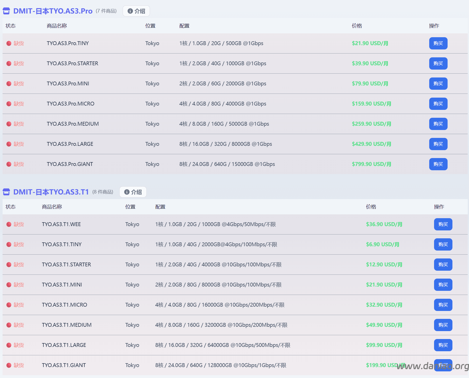 DMIT:日本CN2 GIA VPS(TYO.AS3.Pro) 售罄,此外该商家的TYO.AS3.T1 VPS套餐也是售罄之后很久没有补货了。据客服透露是没有了IP导致的缺货。目前DMIT还有美国洛杉矶和中国香港VPS可供选择,美国洛杉矶可选择:LAX.Pro – Premium套餐、LAX.EB常规套餐 – 三网回程 CMIN2、LAX.T1套餐。中国香港VPS可选择HKG.EB、Premium以及Tier 1套餐。