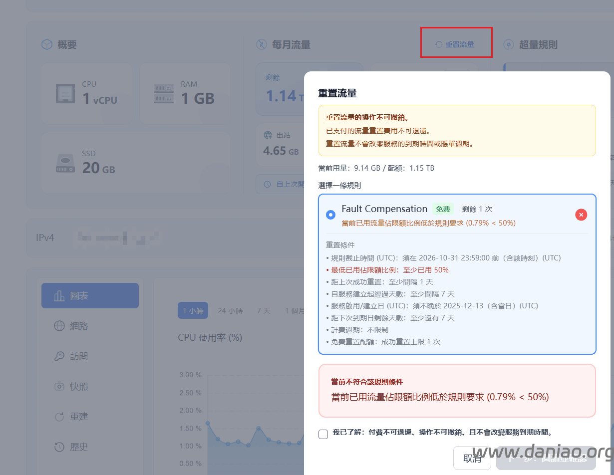 - 付费重置流量要求当前服务使用的流量已超过配额 60%,并符合其余条件。