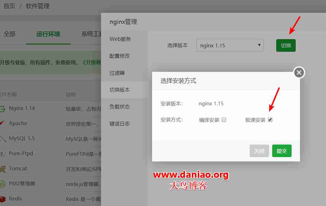我们选择急速安装即可,之后提交等待就可以了。这里说下,升级之前还是要备份下网站或者个网站做个快照之类的。以防不测。这里官方内置的是Nginx版本是1.15.6也是目前最新的版本。
