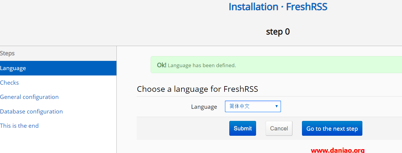 选择中文,然后直接submit这样就会跳转到FreshRSS检查服务器环境页面,检查通过就可以继续安装了。
