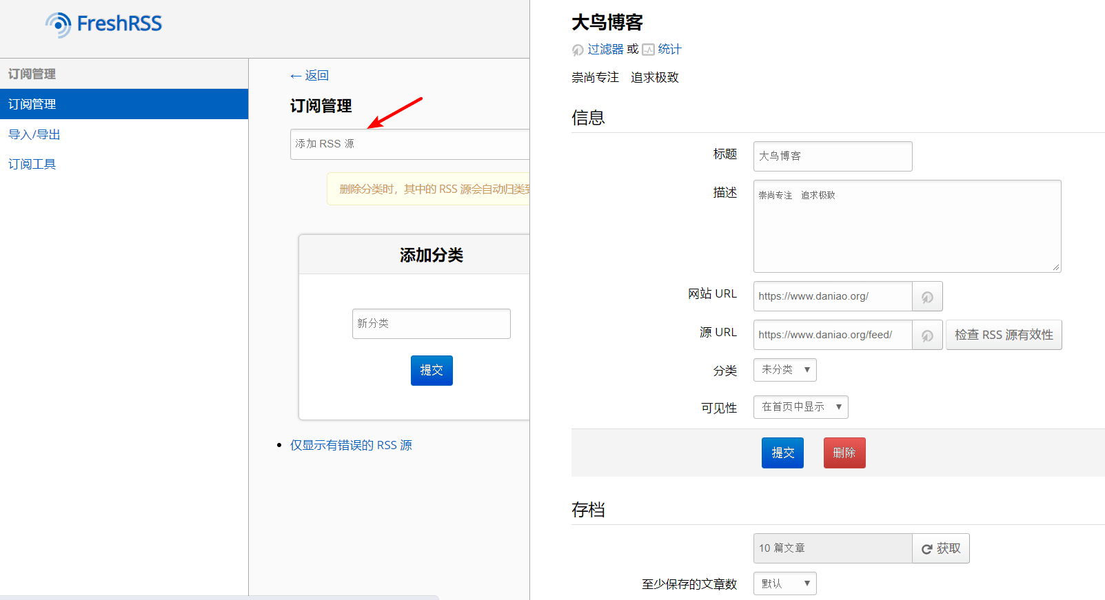 点击“订阅管理”,然后你就可以输入RSS Feed地址了,你还可以给RSS源设置分类。如图: