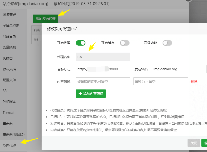 宝塔面板设置“饭袋”还是很简单的,我们先新建一个网站,域名自己解析好,然后。网站设置→反向袋里,如图: