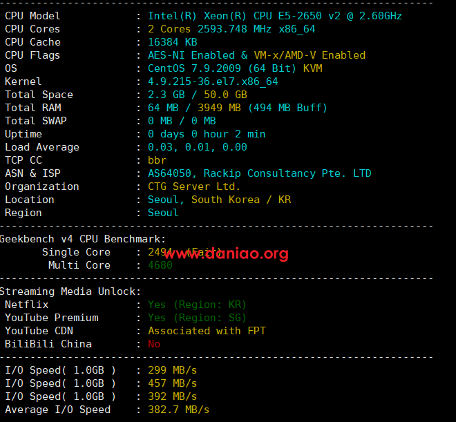 CPU E5-2650 v2 @ 2.60GHz,磁盘IO:382.7 MB/s