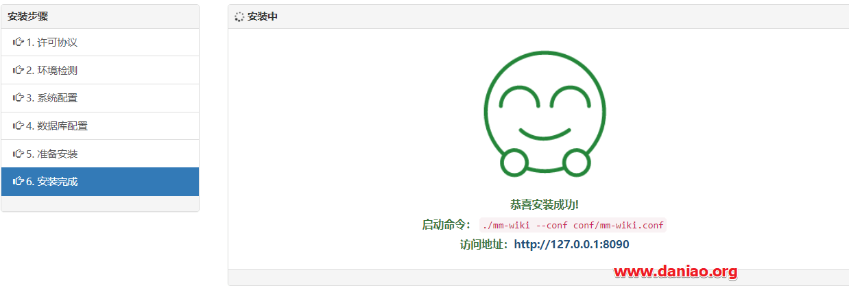 # Ctrl + C 停止 install 程序, 启动 MM-Wiki 系统 cd .. ./mm-wiki --conf conf/mm-wiki.conf # 浏览器访使用域名访问吧 # 开始 MM-Wiki 的使用之旅吧!