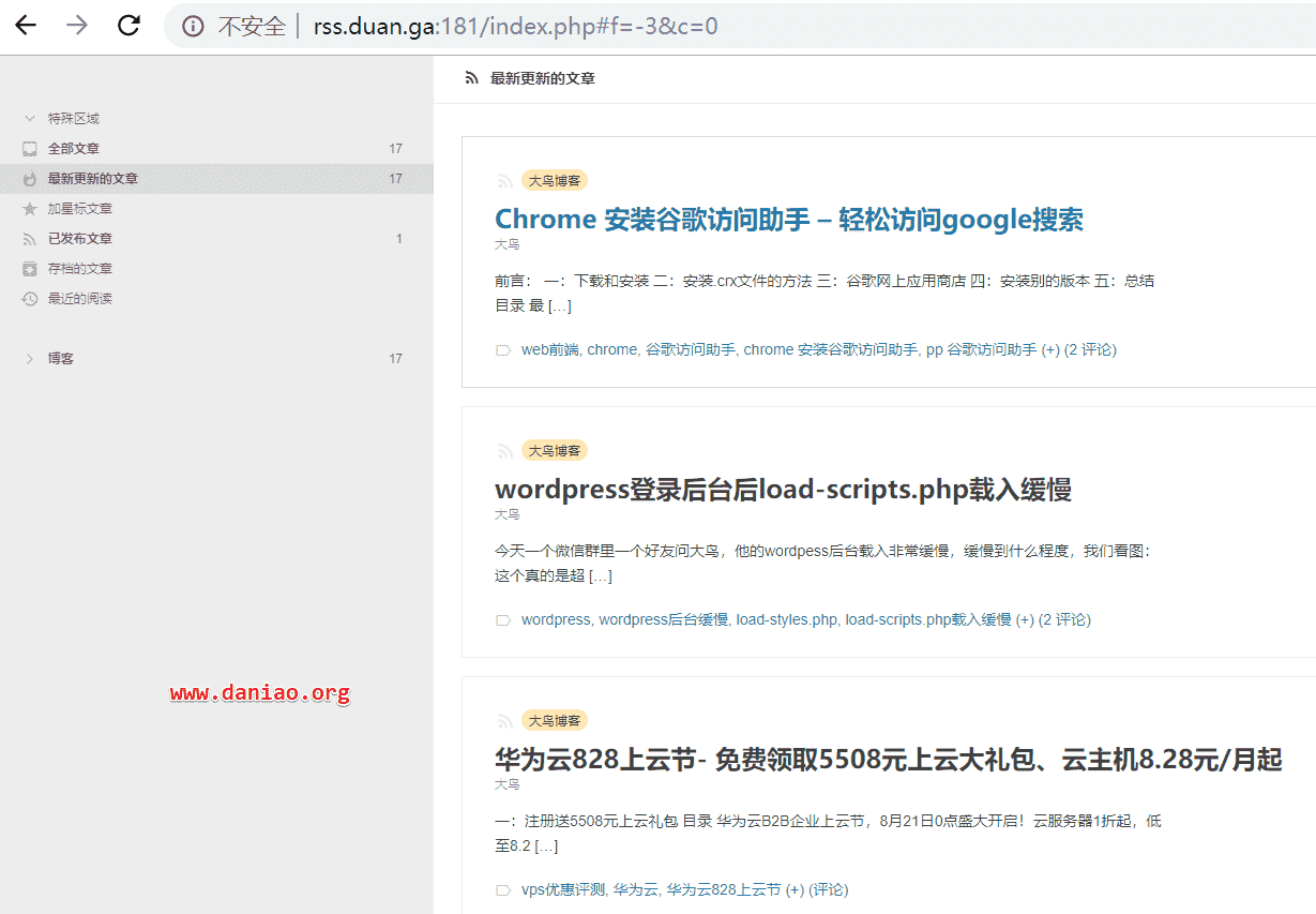 用docker来搭建Tiny Tiny RSS非常方便,大鸟这还是借助了宝塔面板来搭建rss。总体使用下来,感觉颜值还可以,其他的也没用,所以不知道。如果喜欢自己倒腾去吧。最后附一张,rss订阅的效果截图: