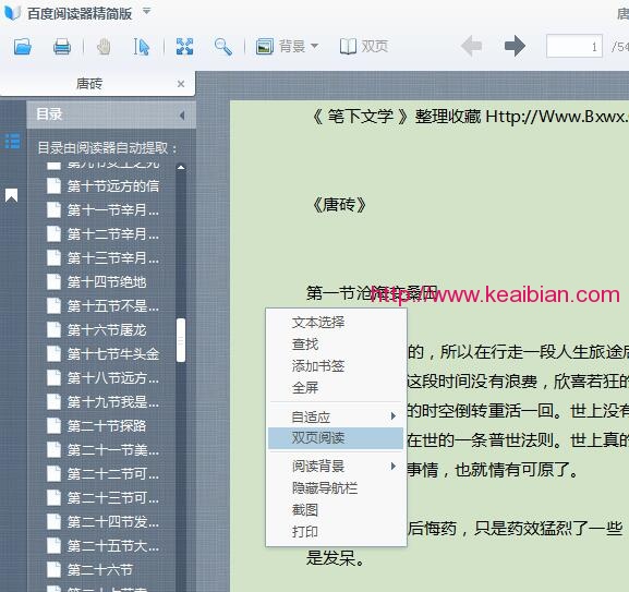 点击打开本地文档,我平时喜欢看一些小说,比如说唐砖这书就挺喜欢看的,我把唐砖txt文件下载到电脑硬盘,然后用百度阅读器打开,界面是这样的。