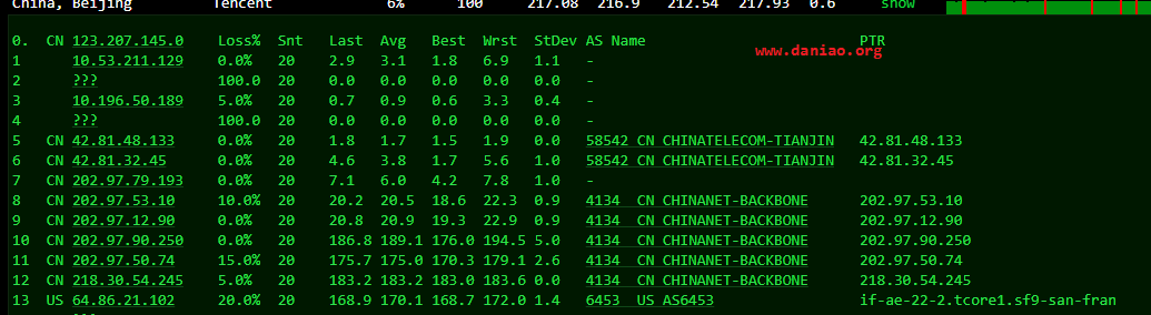 8.|-- 219.158.97.205 0.0% 10 185.1 184.5 182.2 187.5 2.0